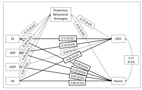 Figure 2. Standardized coefficients for the Study 2 mediational model (a, b, and c’ paths) from Substance Use Risk Profile Scale (SURPS) [4] personality traits to heavy episodic drinking (HED) and alcohol-related harms (Harms) through protective behavioral strategy (PBS) use. SS = SURPS Sensation Seeking; IMP = SURPS Impulsivity; HOP = SURPS Hopelessness; AS = SURPS Anxiety Sensitivity. Light lines represent indirect effects through PBS use and heavy lines represent direct effects. Solid lines represent significant paths; dashed lines indicate non-significant paths, p < 0.01.