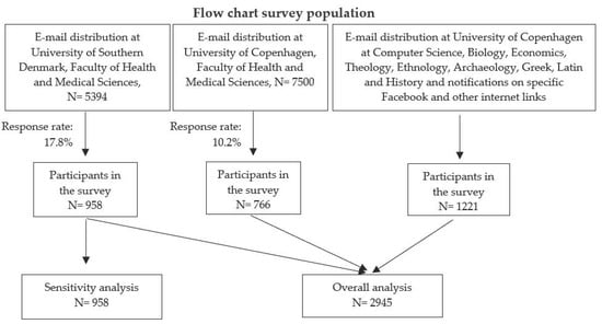 An invitation email with the research aims and objectives was sent to all bachelor’s, master’s and PhD students at the Faculty of Health Sciences at the University of Southern Denmark on May 11th, 2020. A reminder was sent to all one week later. On June 5th, from 5394 invited students, 958 had answered (response rate of 17.8%). At the University of Copenhagen, all bachelor’s and master’s students at the Faculty of Health Science were contacted on May 29th, 2020, and no reminder was sent. In all, 766 of 7500 contacted students answered (response rate 10.2%). Students in Computer Science, Biology, Economics, Theology, Ethnology, Archaeology, Greek, Latin and History at the University of Copenhagen (app. n = 4900) further received the survey invitation, and notifications on specific Facebook pages generated an additional 1221 entries. In total, 2945 students participated in the study. A flow chart of data collection and analysis is presented in Figure 1.