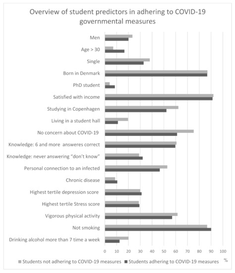This cross-sectional survey among Danish university students describes predictors of self-reported adherence to COVID-19 measures implemented by the government. In the multiple stepwise regression model, older age, concern about COVID-19 and depression were positively associated with following governmental recommendations. In addition, living in a student hall, being physically active or having mental stress were negatively associated with following governmental recommendation. These predictors are in line with results in other studies [1,2,3,4]. However, we need to consider that only 9% of the variation in following governmental recommendations could be explained by the analyzed predictors, and many other factors remain unobserved. Overall, a high percentage (68%) reported that they followed measures implemented by the government. The high adherence can be explained by the high governmental trust given in Scandinavian countries [4]. This trust is discussed as the most important driver for following governmental recommendations [5].