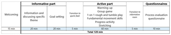 After the informative part, fathers and children will move to the sports field/hall where the active part of the sessions will take place. The active part of the session (60 min) includes various exercises and activities for fathers and their children. More specifically, each session will include six different exercise components, with each session having two to four fundamental movement skills (FMS) as the main theme throughout the session (see Table 4 for the different themes of the active part). In Supplementary File S3, an overview of the different FMS practiced in each session can be found in more detail. An overview of the last component of the active part (i.e., the progress activity, with the aim to rehearse and perform better on all the FMS learned throughout the sessions) can be found in Supplementary File S4.
