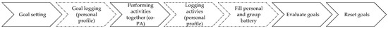 The online part of the intervention consists of a website (www.rundaddyrun.be (accessed on 14 January 2021)) with a profile that can be accessed by all participants with their personal login and password, during the entire 14-week intervention period. A visual representation of this personal platform can be found in Supplementary File S5. As eHealth components of an intervention are more effective when they include one or more behavior-change techniques (BCTs), the online platform will consist of the BCT goal setting, self-monitoring, shaping knowledge and instructions on how to perform the behavior. More specifically, fathers and children will be asked in each session (six times in total) to set a (SMART) co-PA goal, and log it on their personal profile. The aim will be to reach this co-PA goal by the next session, by performing and logging co-physical activities at home (i.e., self-monitoring). For a graphical representation of this logging process, see Figure 3. By logging activities performed together, participants will fill their “personal battery” (i.e., which is full when reaching the personal goal), as well as the “group battery” (i.e., which is full when all individual goals of the group are reached). In each subsequent session, goals will be evaluated and a new, modified goal will be set. The aim of this new goal is to find an optimal balance between achievable and challenging.
