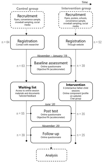 The recruitment phase will take place in November 2019–January 2020. The CG will be asked to participate in a study that investigates health-related behaviors over time, whereas the IG will be asked to participate in a study providing six (inter)active father-child sessions over a total period of 14 weeks. When interested in participating, fathers will be able to register for the study by contacting the researcher (control group) or by registering through an online registration form available on the Run Daddy Run website (intervention group). After registration, the participants will be checked for their eligibility (see Section 2.2.2) and eligible fathers will be asked to complete an online questionnaire and to wear an accelerometer during 7 consecutive days (see Section 2.2.7). The baseline measurements will take place in November-December 2019 for the CG and in January 2019 for the IG. After the completion of the baseline measurements, participants of the IG will receive an email or text message in which they will be informed about the start of the intervention (i.e., date, time and location) and some practical information regarding the first session. In each session, attendance of the father-child dyads will be logged by the facilitators. When a father-child dyad does not attend a certain session, a message (i.e., text message or email) will be sent afterwards with a link to the website where both the information given in the information part and the exercises in the practical part can be found. However, participants who do not attend the first two sessions, will be excluded from the study. Last, post-test measurements will take place after the intervention, in June 2020 and the follow-up measurements will take place in November 2020.