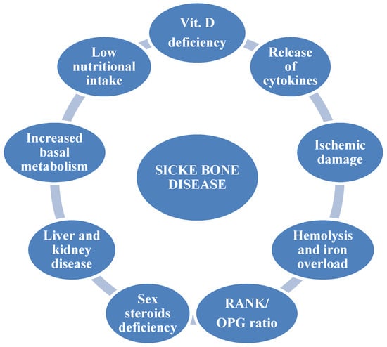 Sickle cell disease (SCD) is an inherited autosomal recessive disorder affecting millions of people worldwide [1]. According to the Global Burden of Disease Study [2], 3.2 million people are affected with SCD, 43 million people are carriers, and 176 thousand people die because of SCD-related complications each year. Sickle cell anemia (SCA) is the most common form, accounting for 70% of cases of SCD in African Americans [3]. A single amino acid substitution in the β-globin chain results in the production of the characteristic hemoglobin S (HbS) which, when deoxygenated, causes red blood cells to take on the typical sickle shape. Clinical manifestations of SCD are variable and affect multiple organs, generally causing a shorter life expectancy. The major cause of morbidity and acute care in this population is represented by acute vaso-occlusive crisis (VOC) due to microvascular occlusion, which leads to increased inflammation and tissue ischemic damage [4]. Bone involvement is common, due to both acute painful VOC and progressive disabilities caused by avascular necrosis. Other acute bone complications in SCD patients are represented by osteomyelitis [5], orbital bone infarction [6], dental problems [7], and bone marrow necrosis. Another severe complication is represented by fat embolism syndrome (FES) consequent to long bone fractures and orthopedic surgery, and characterized by respiratory failure, neurological involvement, skin rashes, and thrombocytopenia [8]. Instead, non-traumatic FES is due to extensive bone marrow necrosis, and is associated with high mortality rates and severe neurological sequelae. The pathophysiological mechanism is unknown, although it exclusively affects patients with mild forms of the disease, often in the context of parvovirus B19 infection [9]. In addition to acute bone involvement, sickle bone disease (SBD) represents a chronic and invalidating complication of SCD. About 80% of SCD young adults have low bone mineral density (BMD), osteopenia, osteoporosis, increased risk of fractures, vertebral collapse, and bone pain [10,11,12]. The reduced BMD in SCD subjects is independent of risk factors typical for the general population such as age, sex, and menopause. Bone loss could partially depend on different factors such as vitamin D insufficiency, low physical activity, malnutrition, and release of inflammatory cytokines (Figure 1) [13]. However, the mechanisms involved in the pathogenesis of SBD are not completely known, especially in pediatric age, and there are no targeted therapies to prevent or treat bone impairment in this population. The bone marrow compensatory hyperplasia and bone ischemic damage secondary to VOC lead to cell sickling, worsening the local hypoxia with a negative impact on osteoblast recruitment. Recent studies have demonstrated that the immediate response to hypoxia is the activation of hypoxia-inducible factor (HIF), which induces the transcription of genes and factors modulating oxygen homeostasis, like erythropoietin, which stimulates osteoclast precursors and induces bone loss [14,15].
