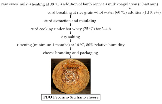 PDO Pecorino Siciliano is a semi-hard cheese produced following a century-old protocol from raw ewe’s milk collected into wooden vats where it is transformed, adding animal rennet in a paste, dissolved into warm water before addition, without LAB starter inoculums. The production area of this PDO cheese is quite wide, because it is represented by the entire Sicily region (South Italy) with its 25,711 km2. The protocol of production was regulated in 1955 [13] making PDO Pecorino Siciliano cheese probably one of the oldest European cheeses whose production has been regulated [14]. PDO Pecorino Siciliano cheese is counted among the pressed-cooked cheeses [15], and the transformation process is graphically reported in Figure 1.