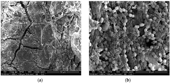 Among the wooden equipment generally used to produce the typical Sicilian cheeses, the vat used to collect the bulk milk for curdling assumes the most important microbiological role because it acts as a reservoir of starter LAB necessary to acidify the curd [18,24,25,26]. The wooden vat is also important to provide the non-starter LAB responsible for the desirable changes occurring during cheese ripening [27,28,29]. Both starter and non-starter LAB are transferred from the wooden vat to the milk during the first minutes of contact [18,24,30] thanks to the biofilms formed on its internal surface [19,31]. A given biofilm is an aggregate of microorganisms embedded into their exopolysaccharides (EPS) adhering to a solid surface [32,33]. The ultrastructure of wood surfaces is porous (Figure 3a), facilitating the absorption and trapping of bacteria, which may develop a complex biofilm (Figure 3b).
