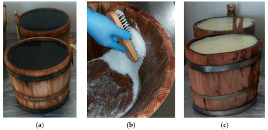 In order to allow the development of the desired LAB onto the internal surfaces of the wooden vats (early bacterial biofilm formation, Figure 4), the new vats, just after their construction, undergo the first treatment with hot water (80 °C) for approximately 30 consecutive days (Figure 4a). This treatment is aimed at removing the tannin components. Subsequently, the internal surfaces of the vats are vigorously brushed with coarse salt (Figure 4b) and filled in with hot water once again to remove the salt. After this surface preparation protocol is applied, the biofilms formed through the daily contact with hot (approximately 70 °C) scotta whey (Figure 4c) for almost seven consecutive days [19].
