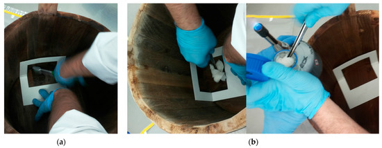 Wooden vat biofilm collection: (a) Brushing; (b) collection by gauze.