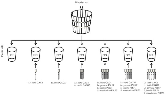Settanni et al. [16] isolated potential starter LAB from acidified PDO Pecorino Siciliano curds, while non-starter LAB was collected from ripened cheeses [6]. Both LAB groups were selected for their main dairy traits: Starter LAB determined the rapid acidification of UHT milk and showed rapid autolysis, while non-starter LAB was chosen for their opposite behavior since a low acidification capacity and slow autolysis are compatible with long ripening times [50]. Sixty-two curd LAB isolates were collected and tested for acidification and autolysis kinetics, but only two strains, both identified as Lc. lactis subsp. lactis, resulted in rapid acidifiers and highly autolytic. The secondary adjunct culture was composed of three strains (one strain per Lc. garvieae, E. faecalis and S. gallolyticus subsp. macedonicus), which were the weakest acidifiers and showed the slowest autolytic activity. These five cultures, individually or in starter/non-starter LAB combination, were applied to produce experimental cheeses in the dairy factory whose cheeses showed the highest levels of spoilage and potentially pathogenic bacteria by Todaro et al. [6]. The bulk milk was collected into the wooden vat daily used by the cheese-maker in order to enrich the milk with the vat biofilms. The entire milk volume was divided into seven aliquots and transferred into plastic vats. One vat was not inoculated with any exogenous LAB culture and represented the control trial, while six vats received LAB inoculums according to the experimental plan (Figure 6). The cheeses were produced applying the traditional PDO Pecorino Siciliano cheese-making protocol, and the ripening lasted five months.