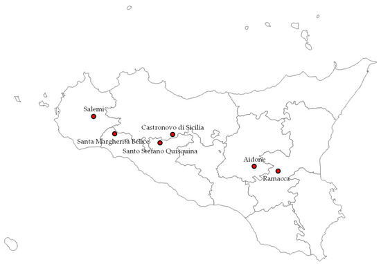 The approach of Settanni et al. [16] was followed by Guarcello et al. [74] to extend the results of the selection of the mixed starter (Lc. lactis subsp. lactis)/non-starter (E. faecalis, Lc. garviae, S. gallolyticus subsp. macedonicus) LAB inoculum to six dairy factories located in different areas of Sicily (Figure 7) within five provinces (Agrigento, Catania, Enna, Palermo, and Trapani), all being part of the consortium for PDO Pecorino Siciliano cheese protection and promotion. The application of the selected LAB was performed in an attempt to stabilize the microbiological characteristics of PDO Pecorino Siciliano cheese, preserving its typicality, throughout the regional territory where the disciplinary allows the production.