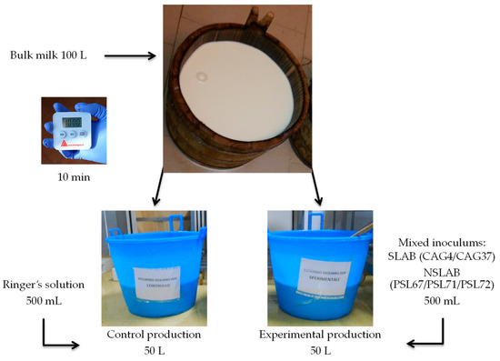 According to the classification of Mucchetti and Neviani [70], based on the treatment of milk and the type of selected starters added, the Italian cheeses can be produced from pasteurized milk inoculated with selected starters, pasteurized milk inoculated with natural starters, thermal treated milk inoculated with natural starters, raw milk inoculated with selected starters, raw milk inoculated with natural starters, and raw milk without starter addition. PDO Pecorino Siciliano cheese belongs to the last cheese typology, which deserves major microbiological attention due to the survival of the raw milk bacteria during cheese production [71], even though vat LAB exerts antagonistic measures [26,37]. From this perspective, PDO Pecorino Siciliano cheese represented a case study to convert the transformation process from raw milk without starters to a production performed with raw milk added with natural starters.