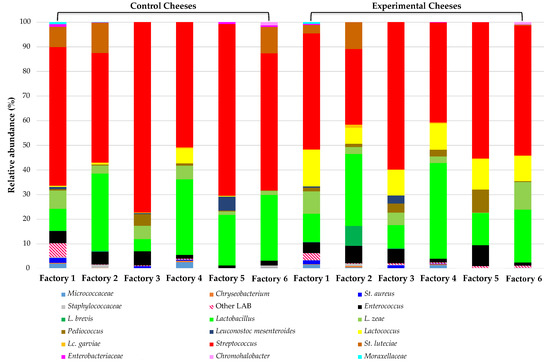 The microbial stabilization of PDO Pecorino Siciliano cheese production through the addition of the selected starter/non-starter LAB was better investigated by a culture-independent approach based on MiSeq Illumina technology by Gaglio et al. [75]. Cheese microbiota analysis showed that all control cheeses were dominated by streptococci and lactobacilli, while the cheeses processed adding the selected LAB were characterized by dominant levels of streptococci, lactobacilli, and lactococci (Figure 9). In particular, in addition to the LAB species inoculated, this approach also revealed the presence of Lt. casei (formerly Lactobacillus zeae) in all cheeses, L. brevis and Ln. mesenteroides only in some factories in both control and inoculated cheeses. The selected LAB culture determined a slight increase in the levels of enterococci.