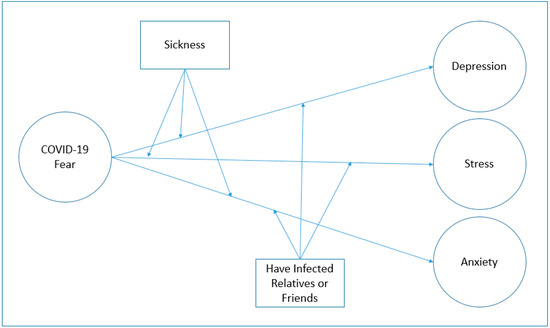 According to the study done by Kimter [48], psychological resilience and being healthy are important individual characteristics in facing the fear of COVID-19 and the psychological problems caused by this fear. Therefore, those people with strong psychological resilience and a healthy life appear to be less affected by COVID-19 [48]. People’s reactions to extraordinary situations may differ if they have an underlying illness, such that those who are sick in extraordinary situations such as a pandemic become more anxious and depressive. With a similar approach, those who have friends or relatives that have been infected with COVID-19 are thought to be more stressed, anxious, and depressive. Encountering or being contacting with infected people who do not show symptoms further increases this anxiety [49,50]. Many studies have found that people who have been sick frequently before COVID-19 are more likely to be adversely affected by COVID-19 [51,52,53,54,55,56,57]. Some studies have shown that individuals whose family or friends have become ill or have died because of COVID-19 have more stress, anxiety, and depression [50,58,59,60,61,62]. Therefore, based on aforementioned ideas the hypothesis 2 is that having an infected or dead family member, relative, or friend has a moderation effect on COVID-19 fear, which causes (i) depression, (ii) anxiety, and (iii) stress; and hypothesis 3 is that having an underlying illness has a moderation effect on COVID-19 fear, which causes (i) depression, (ii) anxiety, and (iii) stress.