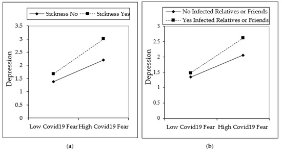 Interaction effects on depression. Moderators of underlying sickness is depicted in (a), having infected relatives or friends is depicted in (b).