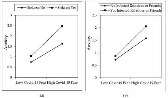 Interaction effects on anxiety. Moderators of underlying sickness is depicted in (a), having infected relatives or friends is depicted in (b).