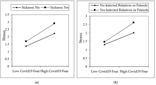 Interaction effects on stress. Moderators of underlying sickness is depicted in (a), having infected relatives or friends is depicted in (b).