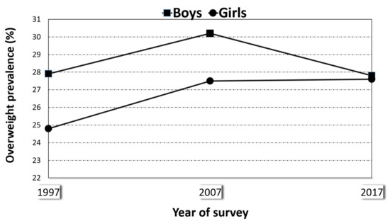 Prevalence of overweight in boys and girls aged 5 to 15 years, Spain (1997, 2007, and 2017).