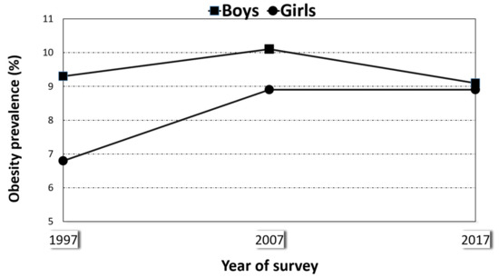 Prevalence of obesity in boys and girls aged 5 to 15 years, Spain (1997, 2007, and 2017).