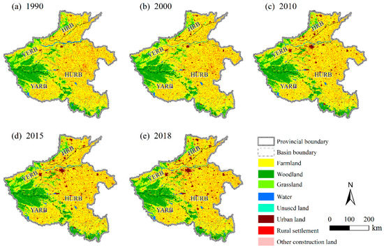 The spatial distributions of land use data in 1990, 2000, 2010, 2015, and 2018 showed that farmland is the main land-use type in Henan Province (Figure 2). Most farmland were found in the HURB. Ecological conservation land, such as woodland and grassland, were mainly distributed in the YERB and YARB. Significant spatial expansion of urban land has occurred in the HRB, YERB, and HURB. We calculated statistics on land use in the four basins according to land functions, to gauge the land-use conditions of the four basins in different periods (Table 3). The areas of food security land in the four river basins had this rank order: HURB > YERB > YARB > HRB. For ecological conservation land, YERB had the largest area, while HRB had the smallest area. In terms of production and living land, its area was still greater in the HURB than the other three basins. More detailed information on the respective area and proportion of land-use types (farmland, woodland, grassland, water, unused land, urban land, rural settlement, and other construction land) in different periods within the river basins can be found in Supplementary Table S1.