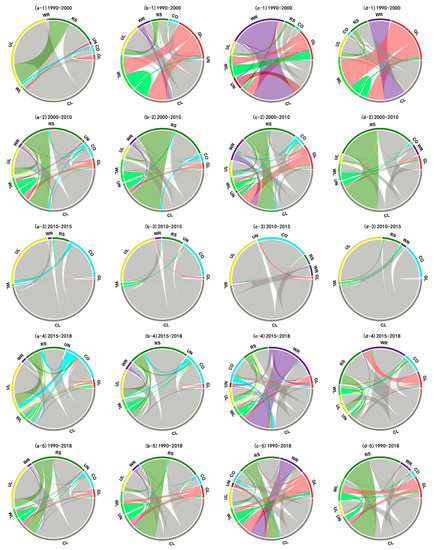 Chord diagrams of quantitative changes in land use/cover (LUCC) change in the four basins, from 1990 to 2018. (a-1), (a-2), (a-3), (a-4), and (a-5) show quantitative changes in LUCC in the HRB. (b-1), (b-2), (b-3), (b-4), and (b-5) show quantitative changes of LUCC in the HURB. (c-1), (c-2), (c-3), (c-4), and (c-5) show quantitative changes of LUCC in the YERB. (d-1), (d-2), (d-3), (d-4), and (d-5) show quantitative changes of LUCC in the YARB. WL, GL, WR, UN, CL, UL, RS, and CO denote the woodland, grassland, water, unused land, cultivated land, urban land, rural settlement, and other construction land, respectively.