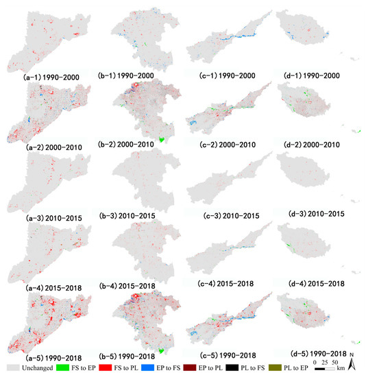 Spatial dynamics of land use/cover (LUCC) in the four basins from 1990 to 2018. (a-1), (a-2), (a-3), (a-4), and (a-5) depict spatial dynamics of LUCC in the HRB; (b-1), (b-2), (b-3), (b-4), and (b-5) depict spatial dynamics of LUCC in the HURB; (c-1), (c-2), (c-3), (c-4), and (c-5) depict spatial dynamics of LUCC in the YERB; (d-1), (d-2), (d-3), (d-4), and (d-5) depict spatial dynamics of LUCC in the YARB. The definition of land-use type abbreviations (FS, EP, PL) can be found in Table 4.