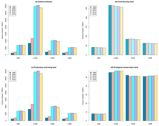 With respect to changes in carbon storage in the four basins, the carbon emitted from the HURB made the greatest contribution to Henan Province’s overall carbon emission (Figure 5a), because the former’s emissions caused by food security land and production and living land were greater than in other three basins, in five periods (Figure 5b,c). The YERB ranked second in terms of carbon emission, followed by the HRB and the YARB. Being the only carbon sink, carbon absorption by ecological conservation land in Henan Province mainly happened in the HURB, the YERB, and the YARB (Figure 5d). In summary, carbon absorption of the four basins was relatively stable during the five studied temporal periods, but their carbon emissions have increased significantly since 2010.