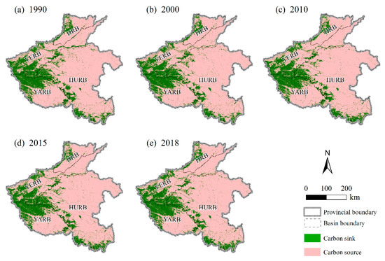 As Figure 6 shows, the spatial distribution pattern of carbon sources and carbon sinks in Henan Province was consistent with the land-use pattern there. The carbon sink in Henan Province was mainly concentrated in the YARB and the YERB, which was conducive to the agglomeration effect of carbon absorption. Although the total amount of carbon absorption in the HURB was relatively large, the spatial distribution of its carbon sink was relatively scattered, resulting in a weaker carbon absorption effect. A strong carbon emission agglomeration effect was present in the HURB, so the pressure on ecological environment protection was also greater. Overall, no major changes occurred in the spatial distribution of carbon sources and carbon sinks in the four basins from 1990 to 2018.