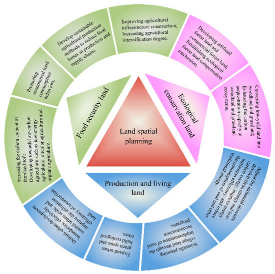 Currently, the delimitation of an “Ecological Protection Red Line,” “Permanent Basic Farmland Protection Red Line,” and “Urban Development Boundary” are also important components in the spatial planning of China’s landscape. Therefore, we argue that the scientific overall arrangement of food security land, ecological conservation land, and production and living land should be rooted in the premise of a leading role for land spatial planning. Based on our research, we first put forward suggestions to reduce carbon emissions from the perspective of land-use changes (Figure 7). Then, we further discuss promising future efforts to reduce carbon emissions in the four basins in Henan Province.