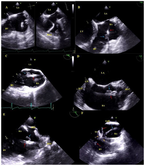 Asymptomatic masses on endocardial leads in 2D TEE. (A)—Thickened hyperechoic distal segment of atrial lead surrounded by a connective tissue sheath. (B)—Thickened hyperechoic segment of atrial lead (red arrow) with a mobile mass representing a clot (blue arrow). (C,D)—Ventricular lead (red arrow) in the RA with mobile vegetation-like masses (blue arrow) (2D, ME modified and bicaval). (E)—Ventricular lead (red arrow) in the RA with a mobile connective tissue mass (accretion) (blue arrow). (F)—The thickened ventricular lead adhered to the TV leaflets, in addition, in RA, the echo associated with the TV (blue arrow) is the sheath of silicone insulation remaining after the first TLE of removing the previous ventricular lead. The place of growth is marked with yellow arrows.