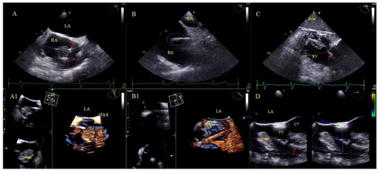 LRIE—TEE images of bacterial vegetations attached to CIED leads. (A,A1)—Bacterial vegetation attached to the lead (red arrows) in the RA in 2D and 3D TEE (bicaval). (B,B1)—Fine vegetations on the lead causing lead thickening with irregular contour (blue circle) in 2D TEE (B)—well visible in 3D TEE (B1)—(bicaval). (C)—Echoes of the lead (red arrow) with vegetations (blue circle) in the RV (2D, TG, TEE). (D)—Large bacterial vegetation attached the ventricular lead (red arrow) dislodging to the TV orifice without significant impact on valve function. The size of the vegetation disqualifies the patient from TLE (2D, 4-CH TEE).