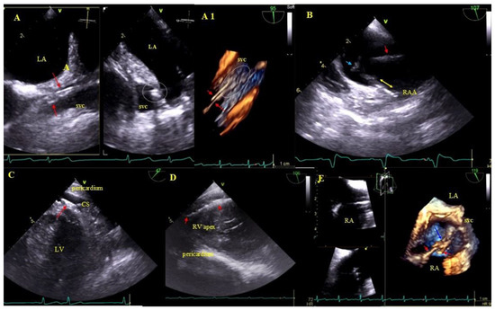 Lead adhesion in various parts of the cardiovascular system. (A,A1)—Two leads (red arrows) bound together and adhering to the SVC wall (2D and 3D, bicaval). (B)—The end of the atrial lead (red arrow) implanted in the RAA adhering to the RA wall (yellow arrow) and a mass on the lead (accretion) (blue arrow) (2D, bicaval, modified). (C)—In the coronary sinus the end of the lead adhering to the vascular wall (red arrow) (2D, TG modified). (D)—Long distal end of the ventricular lead (red arrows) adhering to the RV endocardium (2D, TG). (E)—In the RA an additional leads (red arrows) fibrous mass (accretion) (blue arrow) at the binding site (3D, bicaval).