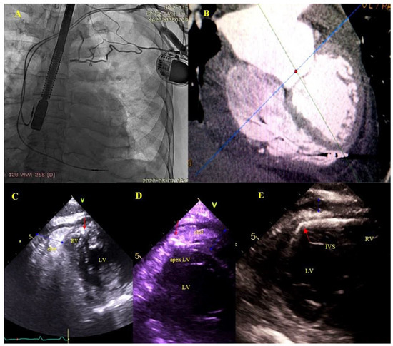 Right ventricular wall perforation by the ventricular lead. An 80-year-old patient with a DDD pacemaker and recurrent pericardial effusion for 3 months. Based on the location of the ventricular lead tip on chest X rays (A)—and TEE, perforation of the RV wall was suspected. ECG-gated CT confirmed the diagnosis (B)—TEE (2D, TG) during the procedure visualized the end of the perforating lead (red arrows) (C–E)—and a clot in the pericardium (blue arrow) (C,D).