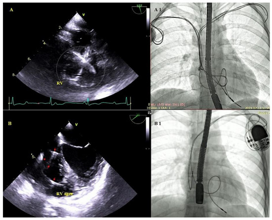 Excessive lead loops in TEE and fluoroscopy during TLE. (A,A1)—Excessive loops of ventricular and atrial leads (white circle) visualized in the RV cavity with multifocal lead-to-lead binding. (B,B1)—Excessive loop of the ventricular lead (red arrows) in the RV cavity.