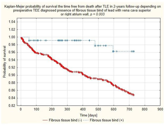Multivariable Cox regression analysis of TEE variables confirmed the negative relationship between the chances of two-year survival and lead-unrelated TV dysfunction (HR = 1.481; p < 0.001) and vegetations (HR = 2.631; p < 0.001), and the positive relationship between fibrous tissue binding the lead to the SVC and/or RA wall (HR = 0.285; p = 0.036), perforation or penetration of the lead through the cardiac wall up to the epicardium (HR = 0.469; p = 0.035) and excessive lead loops (HR = 0.528; p = 0.026) (Table 3).