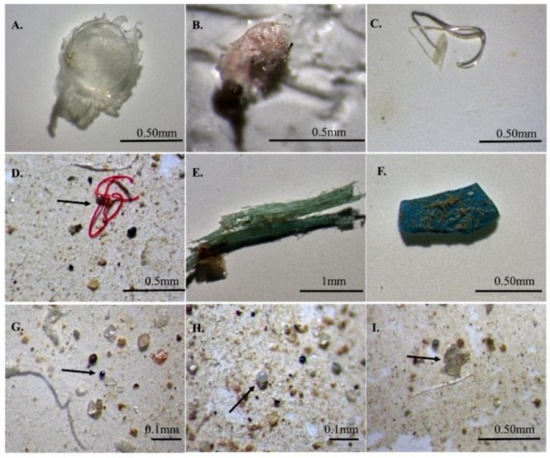 Photographs of different types of typical microplastics (MPs) observed in six aquaculture ponds (A–I): (A,B,I) films; (C,D) fibers; (E,F) fragments; (G,H) pellets.