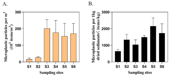 The abundance of MPs in surface water (A) and sediment (B) of six aquaculture ponds in the Pearl River Estuary (mean ± S.D.).