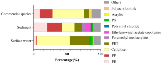 Given the results of component analysis, different types of polymers were identified in the selected samples, mainly cellulose, polystyrene (PS), polyethylene terephthalate (PET), and polyethylene (PE) (Figure 4). Consistent with other findings on seawater [44,45], fresh water [46,47], and mariculture [23,24], more small-sized MPs were found in surface water, especially <0.5 mm, accounting for 42.78% of all MPs in water samples (Figure 5C). The colors of MPs observed in surface water samples were mainly transparent (90.65%) and blue (7.62%) (Figure 5E). The dominant form of MPs was fibers, accounting for 98.04%, followed by fragments (1.14%) (Figure 5A). There was no significant difference in microplastic morphology among sampling sites.