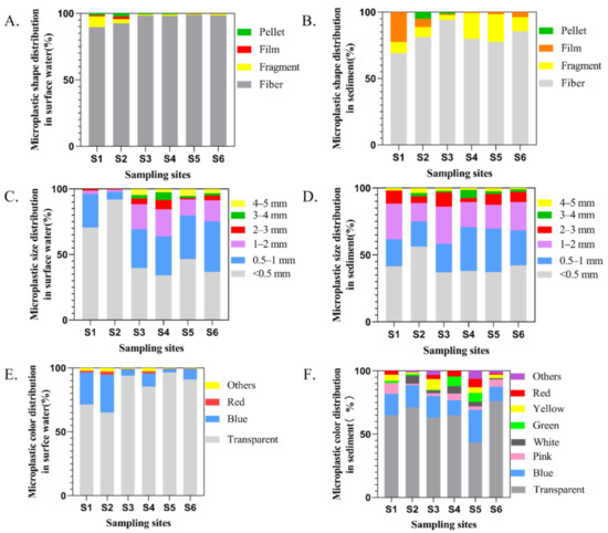 Types of microplastics in water (A) and sediments (B); size distribution of microplastics in water (C) and sediment (D); the proportion of microplastic color in water (E) and sediment (F).