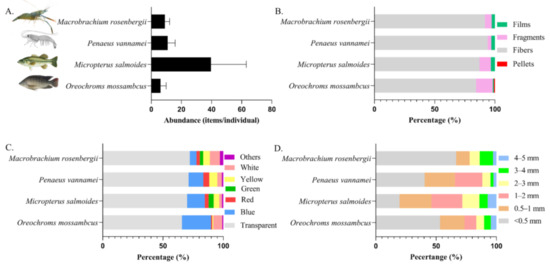In this study, 37 biological samples of two kinds of fish and two kinds of shrimp were collected from six ponds, and MPs were detected in all biological samples. Among them, the abundance of MPs in Oreochroms mossambcus ranged from 3 to 13 items/individual, with an average value of 6.14 ± 3.80 items/individual; the microplastic abundance ranged from 12 to 92 items/individual in Micropterus salmoides, with an average value of 39.64 ± 23.38 items/individual; the abundance of MPs in Penaeus vannamei ranged from 4 to 21 items/individual, with an average value of 10.87 ± 4.94 items/individual; and the abundance of MPs in Macrobrachium rosenbergii ranged from 5 to 12 items/individual, with an average value of 9 ± 3.16 items/individual (Figure 6A). Since the gastrointestinal tissues were not weighed separately in this study, the MP abundance per gram of GIT was not calculated here. The species, weight and body length information of fish and shrimp are shown in Table S1. Cellulose, PP and PE were the main polymer types in organisms (Figure 4). As for colors, transparent and blue dominated, while more yellow and white MPs were also observed (Figure 6C). The most abundant MPs were fibers, and a certain number of fragments were also found in the GITs of fish (Figure 6B).