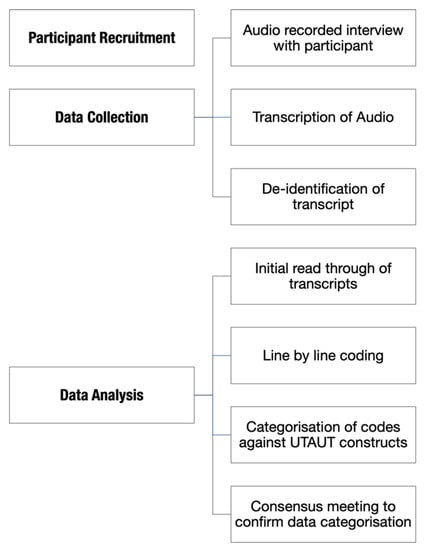 Thematic Content Analysis was used to analyse data collected from semi-structured interviews. The tenets of the UTAUT [] were then deductively applied. The UTAUT was designed to be used in quantitative research to develop questionnaires based on key constructs. However, researchers have adapted the model outside this context. This has included applying the UTAUT to characterise factors in the literature that enable adoption of EMRs [], to deductively analyse qualitative interview data [,] and to design semi-structured interview guides based on UTAUT constructs. Refer to Figure 1 to see a process diagram showing how the study data was collected and analysed