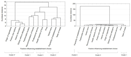 In Poland, four groups of factors were identified, and three groups could be distinguished in Turkey. Consumers in Poland were most influenced by a combination of factors such as location, recommendations, and customer service (cluster 1: 59.0%). In second place of importance were a varied menu, the popularity of the venue, and the taste of the meal (cluster 2: 143%); and in third place were the price and the health aspect of meals (cluster 3: 92.0%). Factors grouped in cluster 1 made little impact on the choice of location for eating out (45.0%). However, in Turkey when consumers were choosing an establishment to eat out at, the most important factors were both price and taste (cluster 1, 80.0%). The popularity of the establishment took second place (cluster 2: 73.0%). On the other hand, a group of several factors, such as professional service, health aspects, dishes without allergens, recommendation of friends, varied menu, interior decoration, the origin of ingredients, availability of differently sized portions, fashionable location (cluster 3: 30.5%), had the smallest impact.