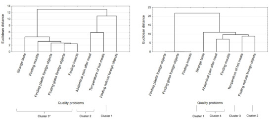 Multidimensional cluster analysis was employed to group the problems indicated by consumers based on the similarities, and the frequencies, of their indication. In Poland, three clusters were identified, and four in Turkey (Figure 2). In Poland, the most serious problem was finding natural foreign objects, such as stones, seeds, pieces of bone (Poland cluster no. 1, 40.0%), while in Turkey it was strange taste (cluster 1: 78.5%). In joint second position in Poland were abdominal pain after a meal, and hot meals being served at too low a temperature (cluster 2: 20.75%), while in Turkey in second position was finding natural foreign objects (cluster 2: 52.5%). In Poland, the least important factors were strange taste; finding molds, glass or plastic foreign objects, and insects in a meal (cluster 3: 4.4%). In Turkey hot meals being served at too low a temperature was in third place (cluster 3: 35.5%), and in joint fourth place, abdominal pain after meal, and finding molds (cluster 4: 33.0%). Turkish consumers did not indicate any problems at all with glass and plastic foreign objects, or insects. The next step in the statistical analysis looked at the significance of the differences between the quantities of the specific problems with the quality of meals eaten outside the home. This was performed using the student’s t-test (Table 5). The quality problems that were more frequent in Poland and those that appeared more frequently in Turkey were identified. The calculations show that generally, problems with the quality of meals eaten away from home arose more often in Turkey than in Poland. The exceptions were problems that did not occur in Turkey at all, in particular finding the presence of insects, pieces of glass, and plastic.