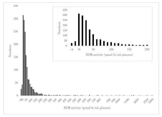The distribution of XOR activity. The vertical axis indicates the number of participants. The horizontal axis shows XOR activity levels ranging from <6 to 4540 pmol/h/mL plasma in increments of 50. The inset figure shows an enlarged version of the distribution of XOR activity in the range from <6 to 200 pmol/h/mL plasma.