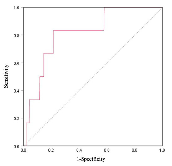 The logistic regression analyses are shown in Table 6. The odds ratios and 95% confidence intervals (CIs) of the high risk for CVD (FRS ≥ 15) were 2.93 (95% CI = 1.16−7.40, p = 0.023). ROC curve analysis for high risk for CVD in XOR activity is shown in Figure 2. The area under the curve (AUC) was found to be 0.81 (95% CI = 0.66−0.97, p = 0.008).