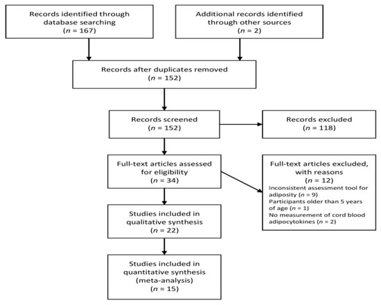 Observational, cross-sectional, and longitudinal studies were examined. Studies of the offspring of healthy pregnant women and those with obesity were included. For studies involving participants with diabetes (type 1 or 2, gestational diabetes), data obtained only from control groups were used, as offspring of mothers with diabetes have higher leptin concentrations for a given fat mass [46,47]. Studies of full term neonates of different growth patterns—appropriate for gestational age (AGA), small for gestational age (SGA), LGA—and ethnic origin were considered eligible. Studies examining neonates born preterm and/or with congenital abnormalities (chromosomal disease, respiratory distress syndrome, heart disease, and renal disease) were excluded. Randomized control trails were not included in the current systematic review. Due to the different criteria used to define SGA, LGA, and obesity across various populations, we accepted the authors’ definition.