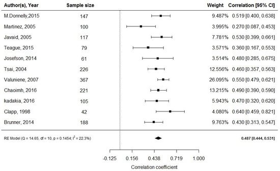 All 11 studies [29,30,31,32,33,34,35,36,37,38,39] assessing 1653 pregnancies, revealed a moderate, positive correlation between cord blood leptin and neonatal adiposity (random effect model; r = 0.487; 95% CI: 0.444, 0.531; Figure 2). Eight studies reported mean levels of cord blood leptin [32,33,34,37,43,44,45,50]. Applying the continuous random effects model revealed a pooled mean value of 9.1 ng/mL (95% CI: 8.27, 9.95; p < 0.001). However, a high level of heterogeneity was present (I2 = 85.76%, p < 0.001).