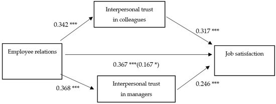 Parallel mediation model (n = 220). Indirect effects of employee relations on job satisfaction through interpersonal trust in colleagues and interpersonal trust in managers. Standardized effects estimates are presented. The effects on the direct path from employee relations to Job satisfaction depict the direct effect and the (total effect). * p = 0.028, *** p < 0.001.