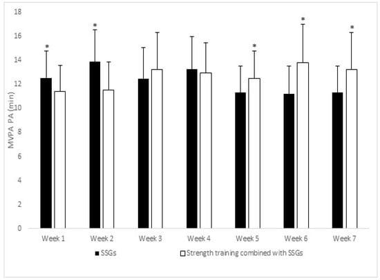 Moderate to vigorous physical activity (MVPA) by weeks. * denotes p < 0.05 differences. SSGs, small-sided games.