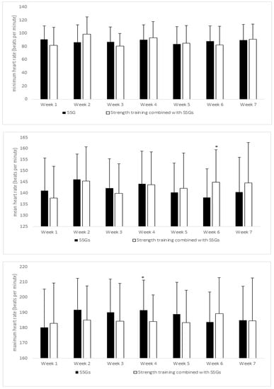 Regarding heart rate, Figure 2 illustrates the minimum heart rate between two training programs. In this case, there are no significant differences. For the mean heart rate for seven-week implementation programs, only in week 6 does the strength training program combined with SSGs show significant differences compared with SSGs only. Finally, the last variable analysed on internal load was the maximum heart rate, which showed significant differences in week 4 in SSGs compared with the strength training program combined with SSGs.
