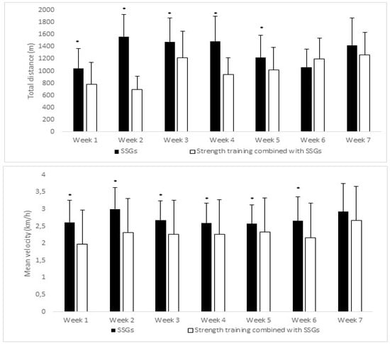 On the other hand, the external load variables were analysed. Figure 3 shows significant differences between SSGs and the strength training program combined with SSGs in weeks one to five. The variable of velocity by weeks shows significant differences in SSGs compared with the strength training program combined with SSGs in weeks one to six.