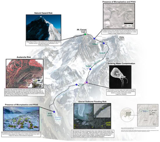 National Geographic and Rolex’s Perpetual Planet Everest Expedition (hereafter the 2019 Everest Expedition) sought to complete novel, interdisciplinary research at and above 5,000m, including biology, geology, glaciology, mapping, and meteorology [] to fill gaps in knowledge in these regions []. This 60-day expedition utilized diverse methodology to analyze water, soil, ice and general topography of the mountain [,,]. While this methodology has been acknowledged in previously published work, the risk profiles of the diverse dynamics discovered have not been compiled. The majority of data presented in this study was collected by the 2019 Everest Expedition and represents a unique, yet still partial, snapshot of the mountain’s changes driven by climate change. Here, we use new data, combined with standing research, to highlight existing and emerging physical and chemical risks on Mt. Everest and the watershed below.
